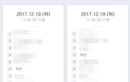 ‘내 계좌 한눈에’ 1단계 서비스를 시행한 12월 19일 정오(낮 12시)무렵의 실시간 검색어 현황. ‘내 계좌 한눈에’ 서비스가 포함된 금융포털 ‘파인’에 대한 검색어가 5위권 안팎을 기록했다.(자료=네이버 포털) |