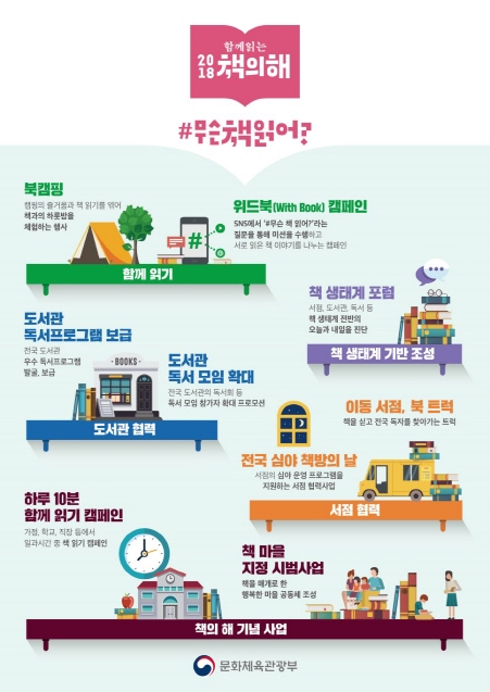 책 읽는 모임을 만들고 싶은 사람들을 위한 ‘책 마을 지정 시범 사업’도 있다. 읍면동 단위 책으로 소통하는 마을 공동체를 만들기 위함이다. ‘2018 책의 해’는 이제부터 시작이다. 4월엔 광화문광장에서 책 축제가 열리고, 올해 12월까지 매달 ‘책 생태계 비전’ 포럼이 열릴 계획이다.
