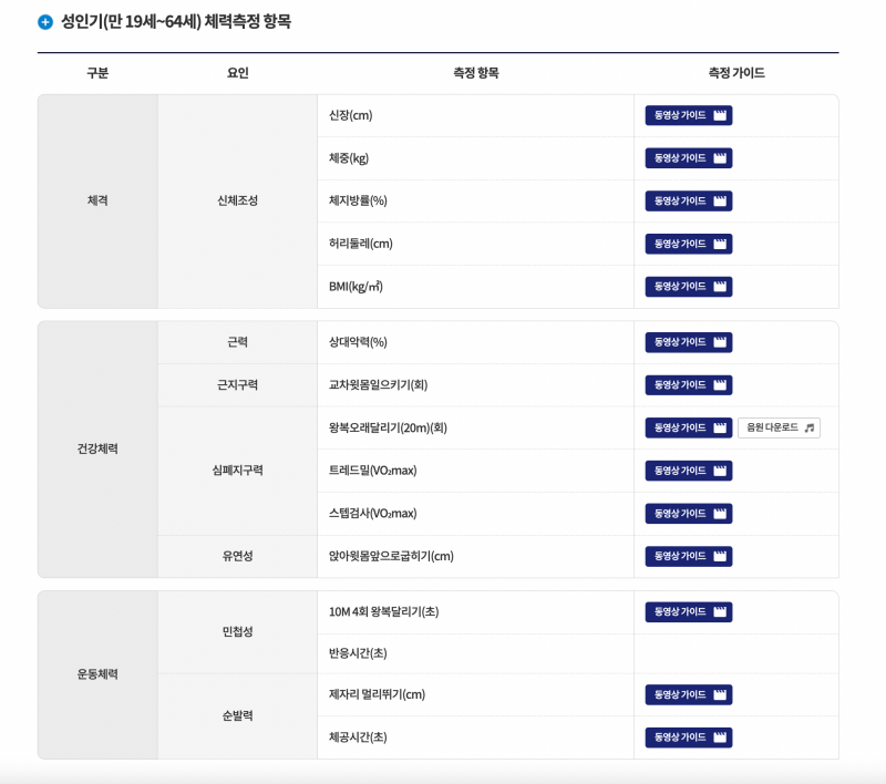 전국에 있는 체력인증센터에서 만 4~6세 유아기와 만 11세 이상 대한민국 국민이면 누구나 체력 상태를 측정, 평가하고 그에 따른 맞춤형 운동 프로그램을 상담받을 수가 있고 체력 수준에 따라 국가 공인 인증서를 발급해 준다. 체력 측정을 받고 싶다면 국민체력100 사이트(https://nfa.kspo.or.kr/main.kspo)에 들어가서 가장 가까운 센터를 확인한 후 예약을 하면 된다.