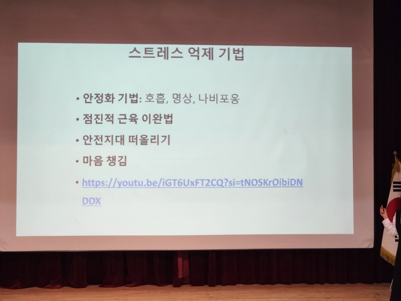 이아라 전문의(경희대학교병원)가 ‘불안, 스트레스 건강하게 다루기’를 주제로 정신건강 교육을 진행했다. 그의 교육은 모두에게 유익한 내용인 것 같았다. 우리는 누구든 살아가면서 알게 모르게 불안과 스트레스가 생긴다. 수시로 찾아오는 불안과 스트레스를 억누르거나 회피하지 않고 인정하고 건강하게 다룰 필요가 있다. 그런 점에서 특강 내용을 기대하고 경청했다. 아래는 이아라 전문의의 교육 내용의 일부를 이해하기 쉽게 재구성해봤다.