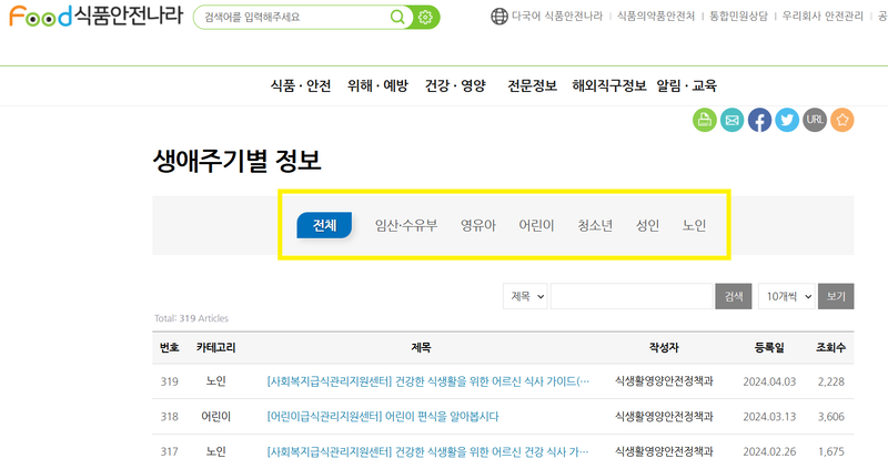 이렇게 임산부, 영유아, 어린이 등 카테고리별로 나눠져 있어서 현재 자신의 상황에 따라서 더욱 자세한 식품 영양정보 확인이 가능합니다.