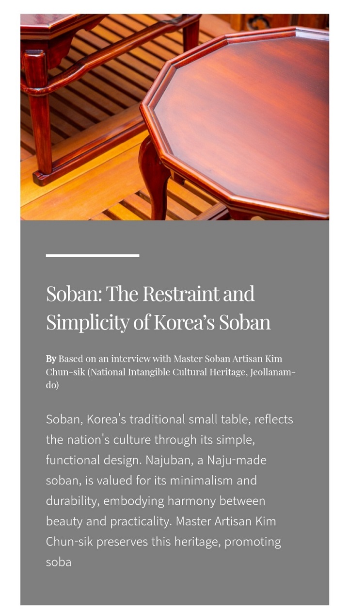 첫 번째로 'Soban(소반)'은 '단순하고 기능적인 디자인'을 지닌 작은 탁자로 설명되며 최소주의를 갖춘 유산으로 소개됐다.