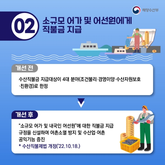 - “소규모 어가 및 내국인 어선원”에 대한 직불금 지급 규정을 신설하여 어촌 소멸 방지 및 수산업·어촌 공익기능 증진
